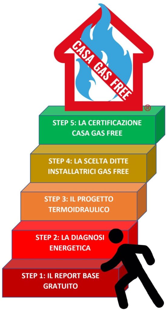 - Lo STEP 1 è il REPORT BASE ovvero l’inizio del percorso di degassificazione della propria casa inizia con una prima valutazione preliminare gratuita. Inserendo i dati della propria abitazione e dei propri consumi per il riscaldamento, ed altre semplici informazioni, ogni cittadino riceverà gratuitamente entro 48 ore (indicativamente) il nostro PDF sotto forma di REPORT con le prima indicazioni tecniche ed una prima valutazione economica per passare in GAS FREE. E’ un passo semplice che dovrebbe fare ogni cittadino, anche se abita in condominio, anche se non ha la possibilità economica di avviare l’iter gas free: l’importante è iniziare a pensarci ed a valutare la trasformazione. Grazie al report, avrai poi a disposizione gli esperti della nostra associazione per ogni domanda ed approfondimento sulle valutazioni fatte per la tua casa per eliminare la caldaia a metano, gpl, gasolio.